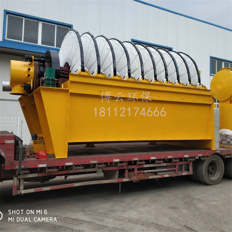 盤式真空過濾機由各個單獨的扇形片的圓盤構成。每一個扇形片為 單獨的過濾單元,由濾布做成布套在扇形片上形成濾室。過濾盤由電機通過減速器及開式齒輪傳動來驅動 ,過濾盤順時針方向轉動,濾室里的礦漿在吸附區借助于真空泵在過濾介質兩側形成的壓力差,附著在過 濾盤上形成濾餅后,攪拌器旋轉防止固體沉淀,濾餅離開液面后,在真空作用下繼續脫去水分。濾液透過 濾布,經過濾液管,從分配頭排出。濾餅在卸料區由反吹風卸料落入排料槽,整個作業過程連續循環進行 。