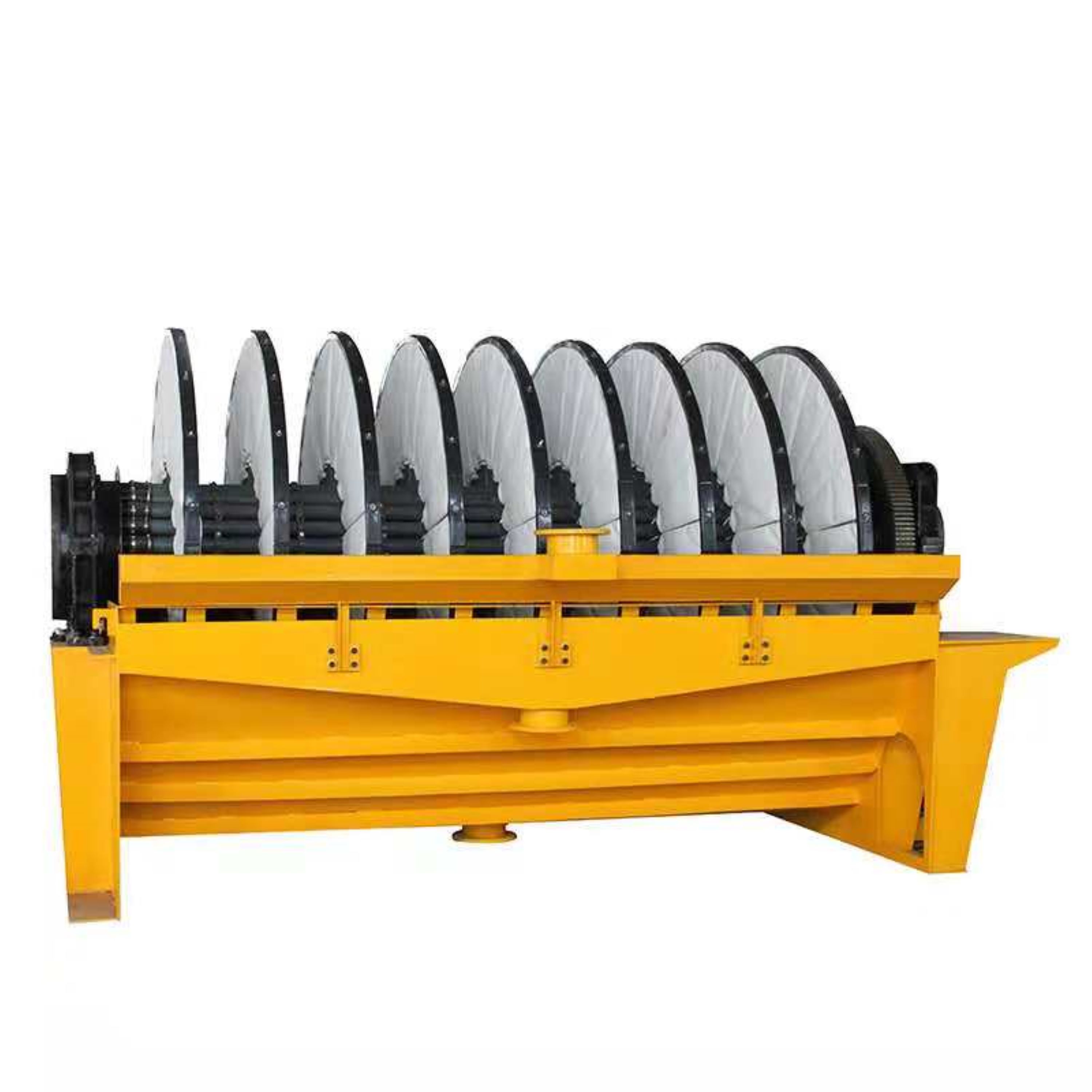 PG系列盤式真空過濾機 (1)扇形濾板脫水孔分布均勻,孔率合理,筋條尺寸大,由高強度工程塑料制成,壽命提高了2-3倍。 (2)濾液管過濾數面大,分配頭腹腔容積大,提高了抽氣率和濾液排放效果。 (3)耐磨錦綸、單或復絲濾布使脫餅率高且不易堵塞,使用壽命長。 (4)多點干油泵集中多點自動潤滑。 (5)濾布自動清洗裝置,保持了其良好的脫水效果。 (6)臥式強制高速攪拌、軸端采用橡膠及石墨盤根和水壓差三重密封不漏漿。 (7)主傳動無級變速,依物料的濃度及流量調節(交流調速電機或變頻器),以求達到理想的工作效果 。 (8)每盤由20片扇形板組成,加強了過濾過程控制,成餅厚度均勻。 (9)磨擦片采用特制耐磨硼鑄鐵,剛柔相濟密封佳,使用壽命達到十年以上。 (10)濾液管為高強度耐磨陶瓷復合鋼管,提高壽命10倍以上。 (11)濾液管與濾扇接口去掉下法蘭,采取模具定位直接焊接,減少了90%可能的漏氣點。